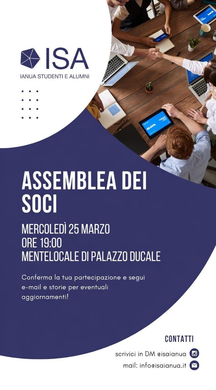Mercoledì 25 marzo 2026 alle ore 19.00, presso Mentelocale di Palazzo Ducale, si terrà l'Assemblea dei Soci dell'Associazione ISA-Ianua Studenti e Alumni.