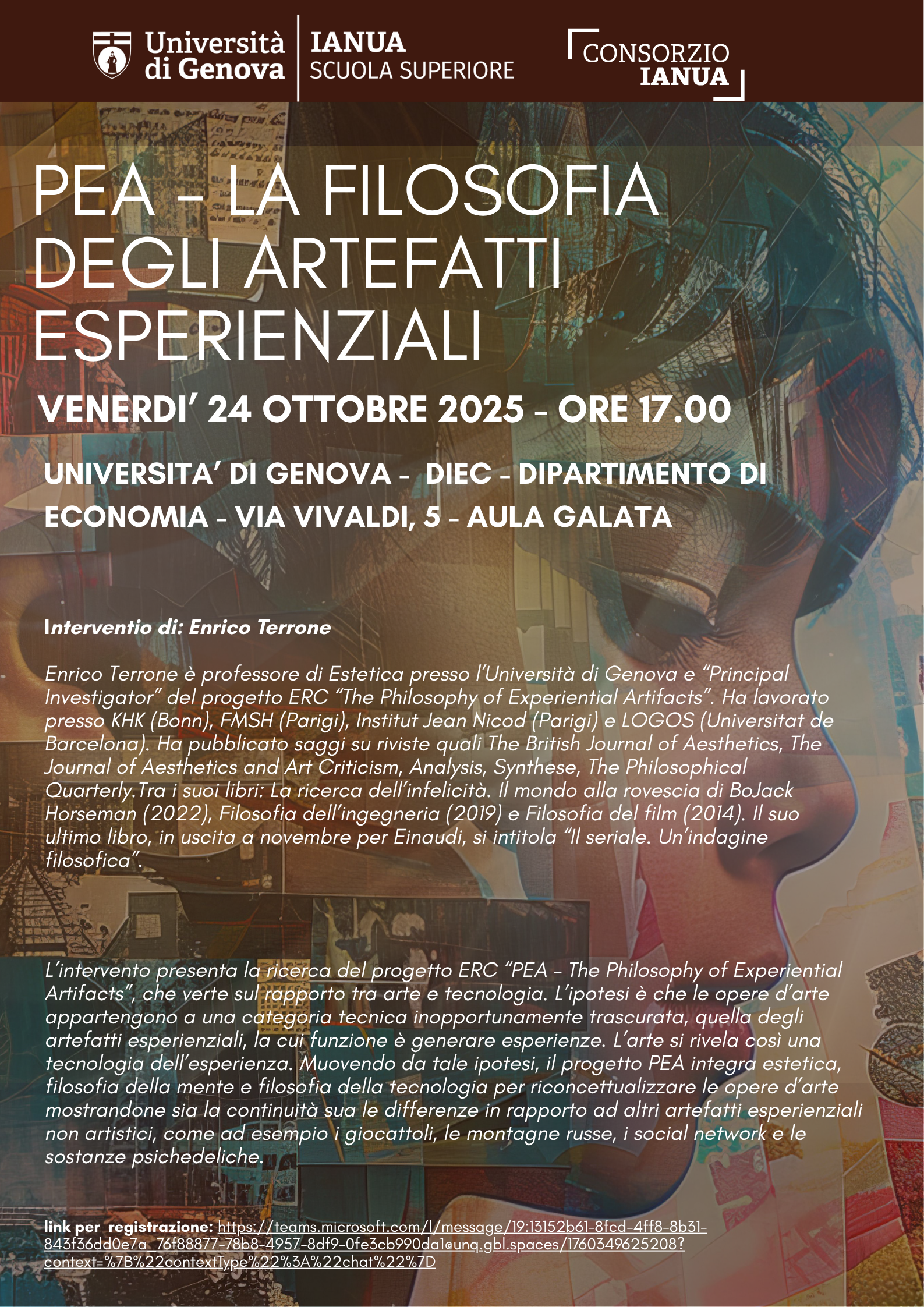 Il seminario presenta la ricerca del progetto ERC (European Research Council) "PEA - The Philosophy of Experiential Artifacts" che verte sul rapporto fra arte e tecnologia.
